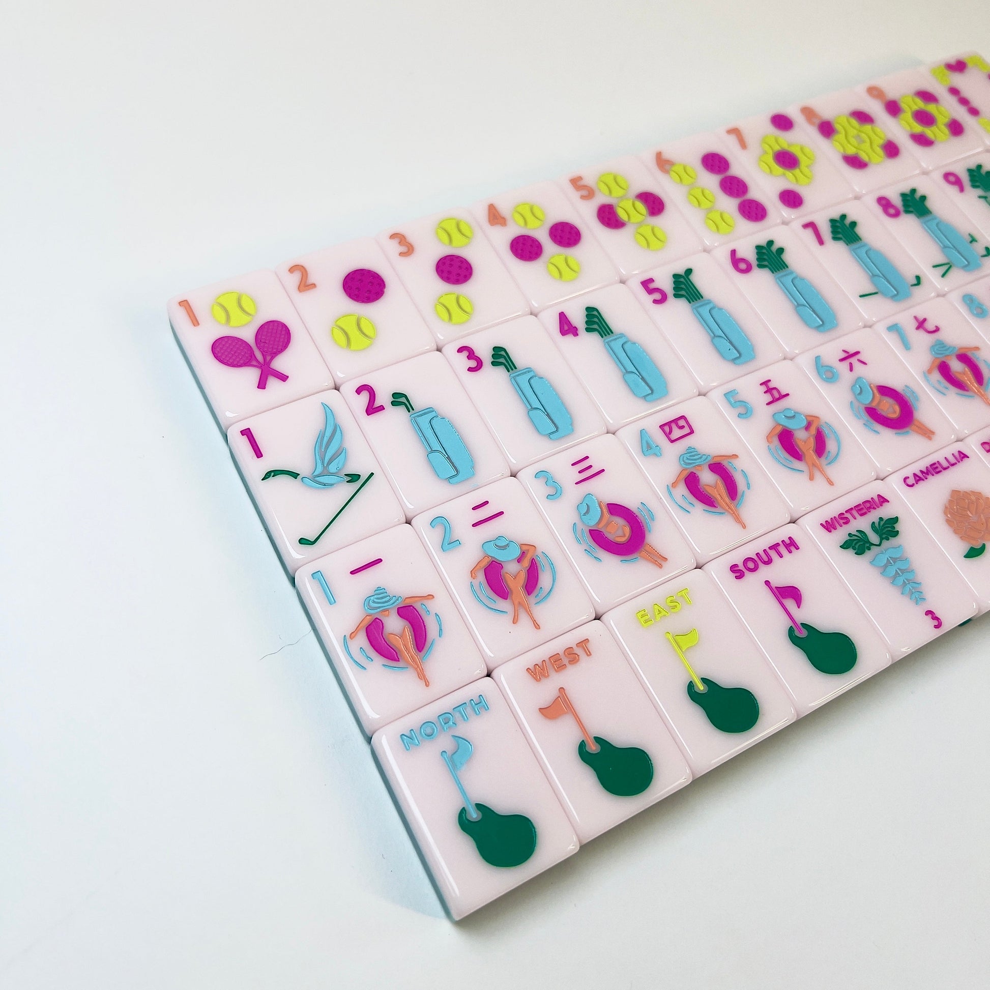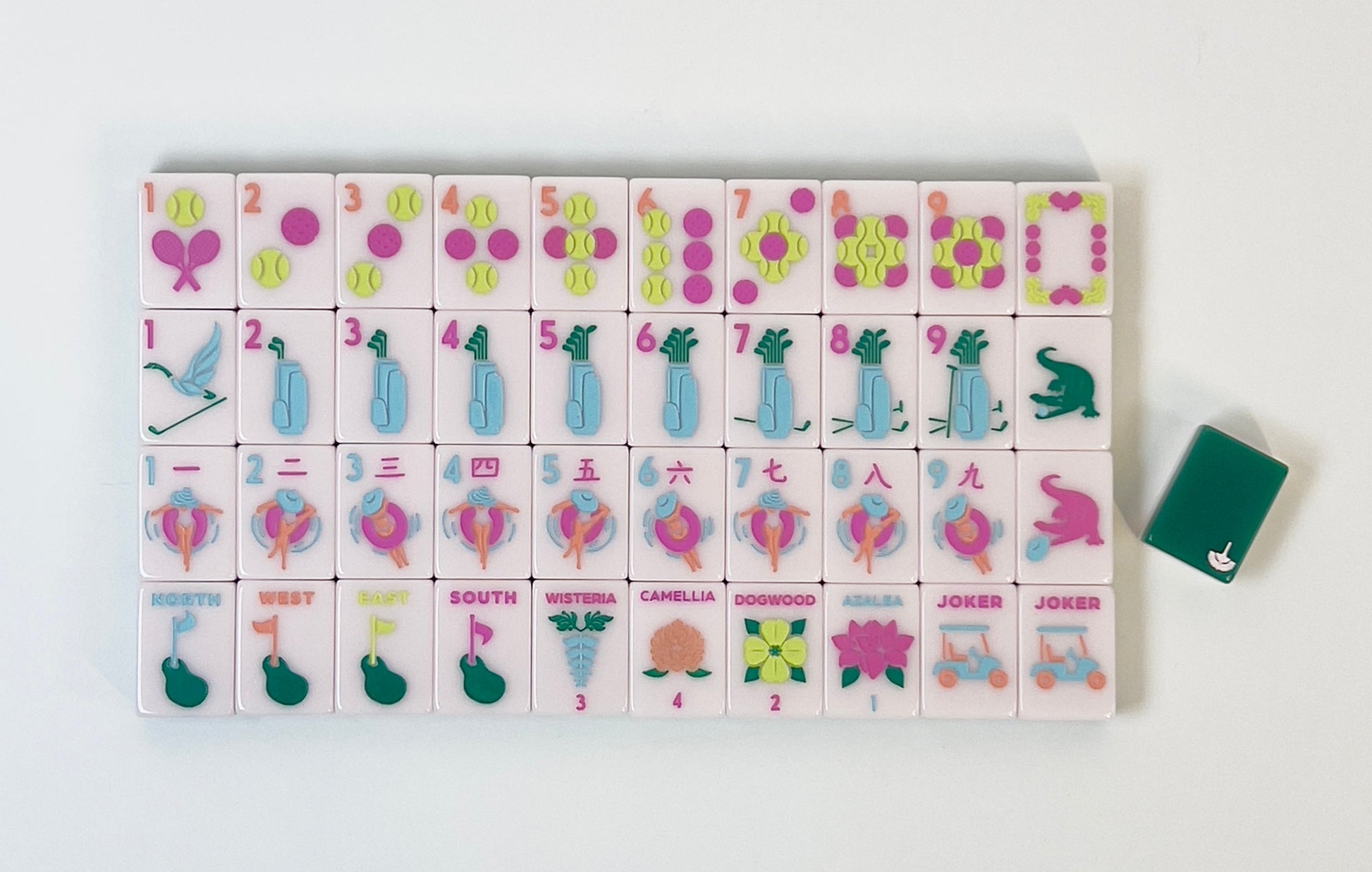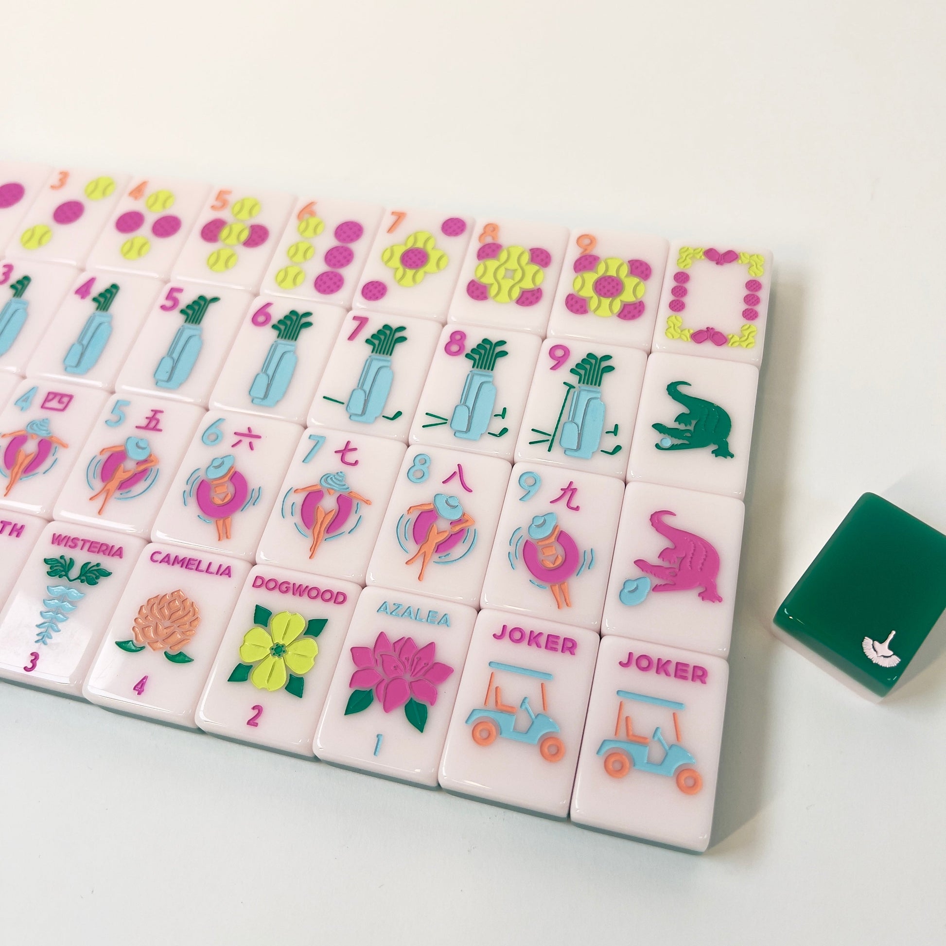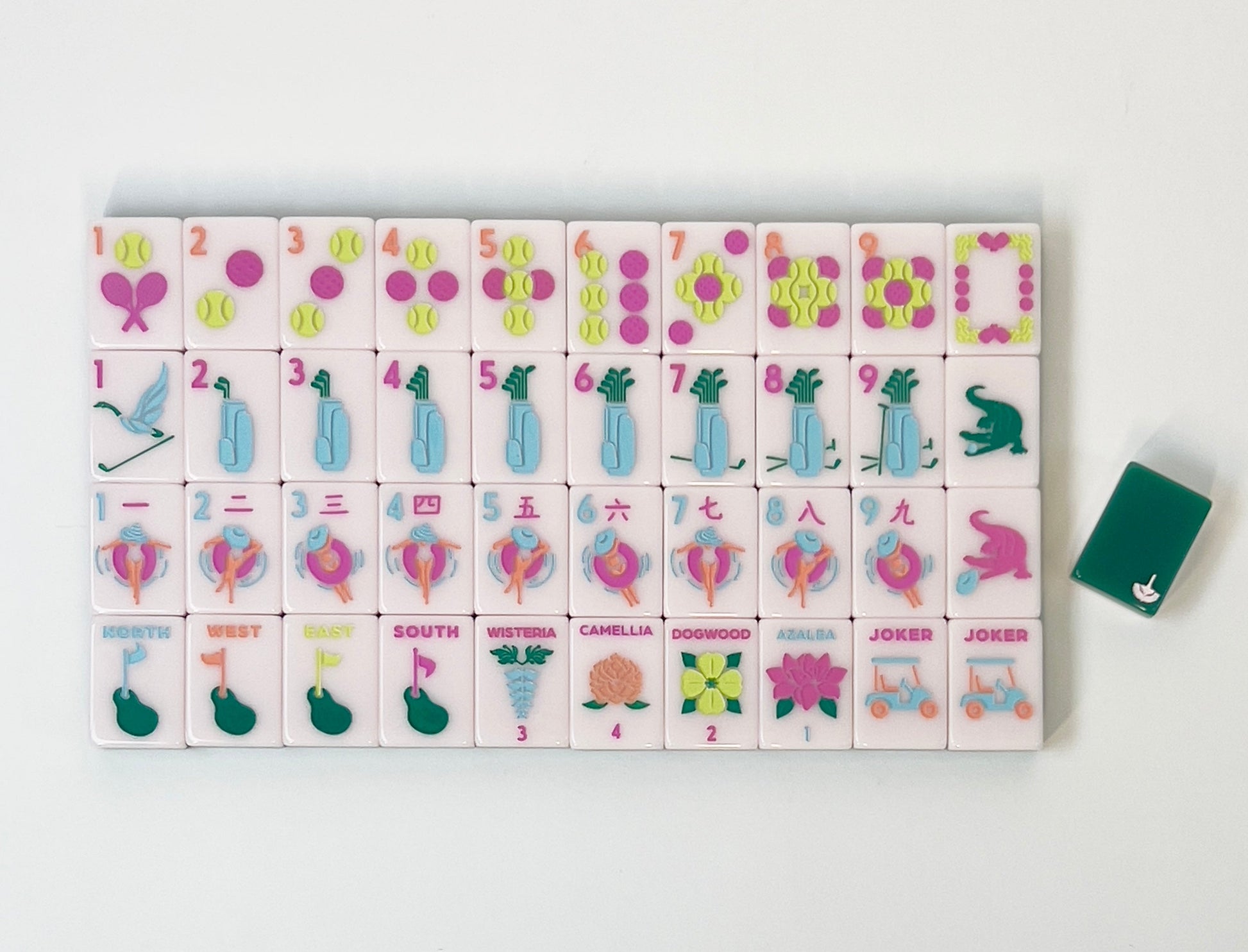 Experience the elegance of country club life with Charleston Mahjong Club's tile set! The Country Club Edition is an exquisite collection that features charming pink and green tiles. The set includes illustrations of golf, tennis, and pickleball, highlighting many popular country club sports. Additionally, it pays homage to the prestigious Masters Tournament, incorporating its iconic flower-named golf holes. Expertly crafted, this luxurious set includes 160 tiles; 4 of each suit tile with matching dragon, 8 whimsical flowers, 4 of each wind, 6 blanks, 10 jokers, 2 field guides, and dice. This tile set is perfect for any mahjong enthusiast who appreciates the sophistication and traditions of a country club lifestyle. Play mahjong with style and enjoy a touch of country club charm in every game.