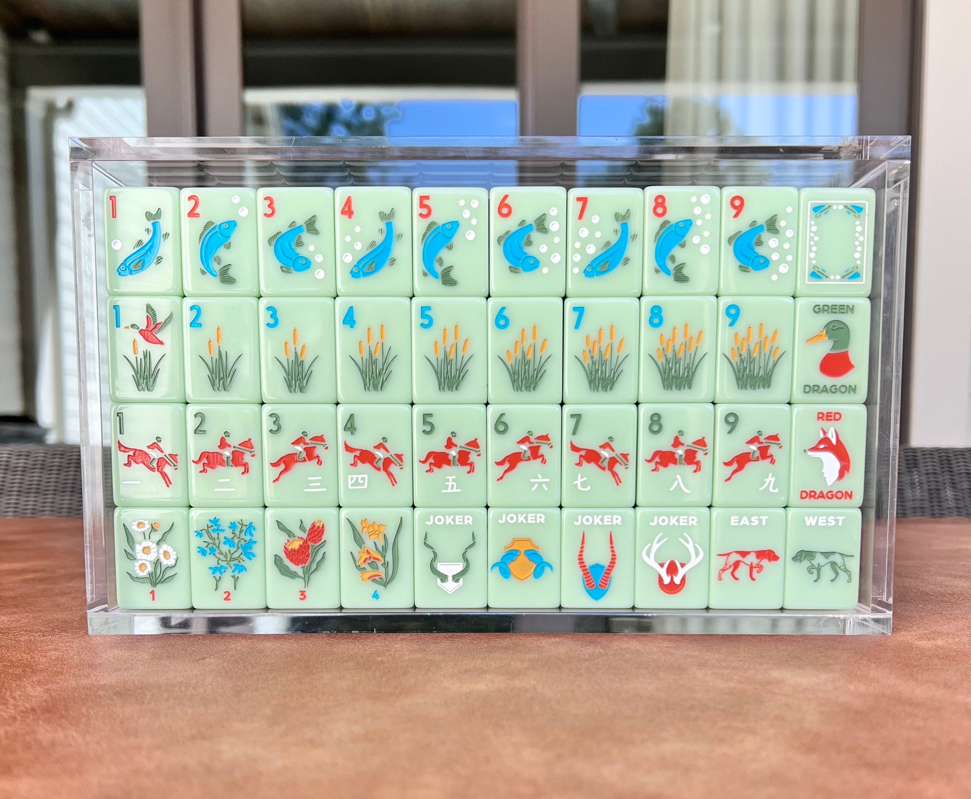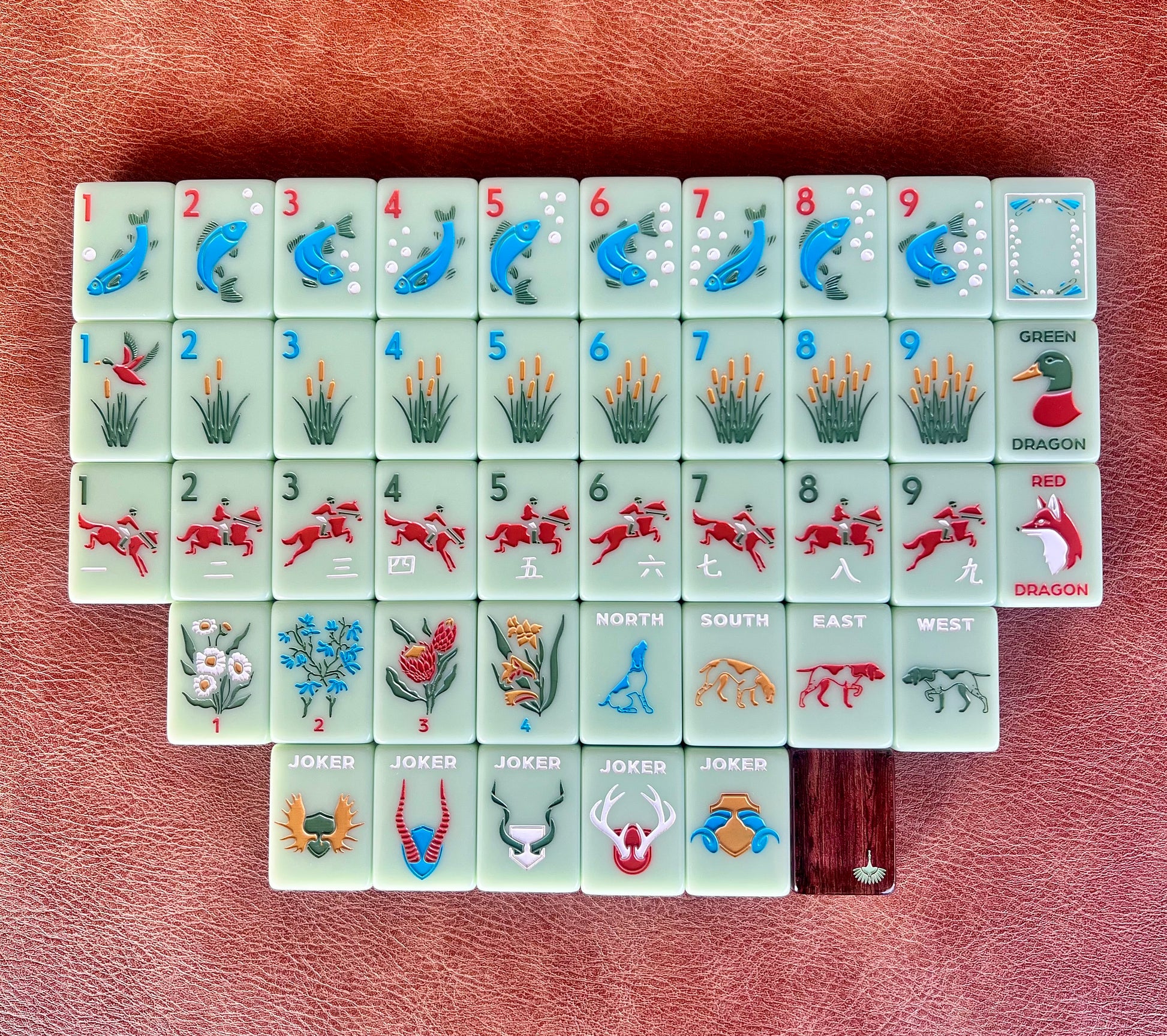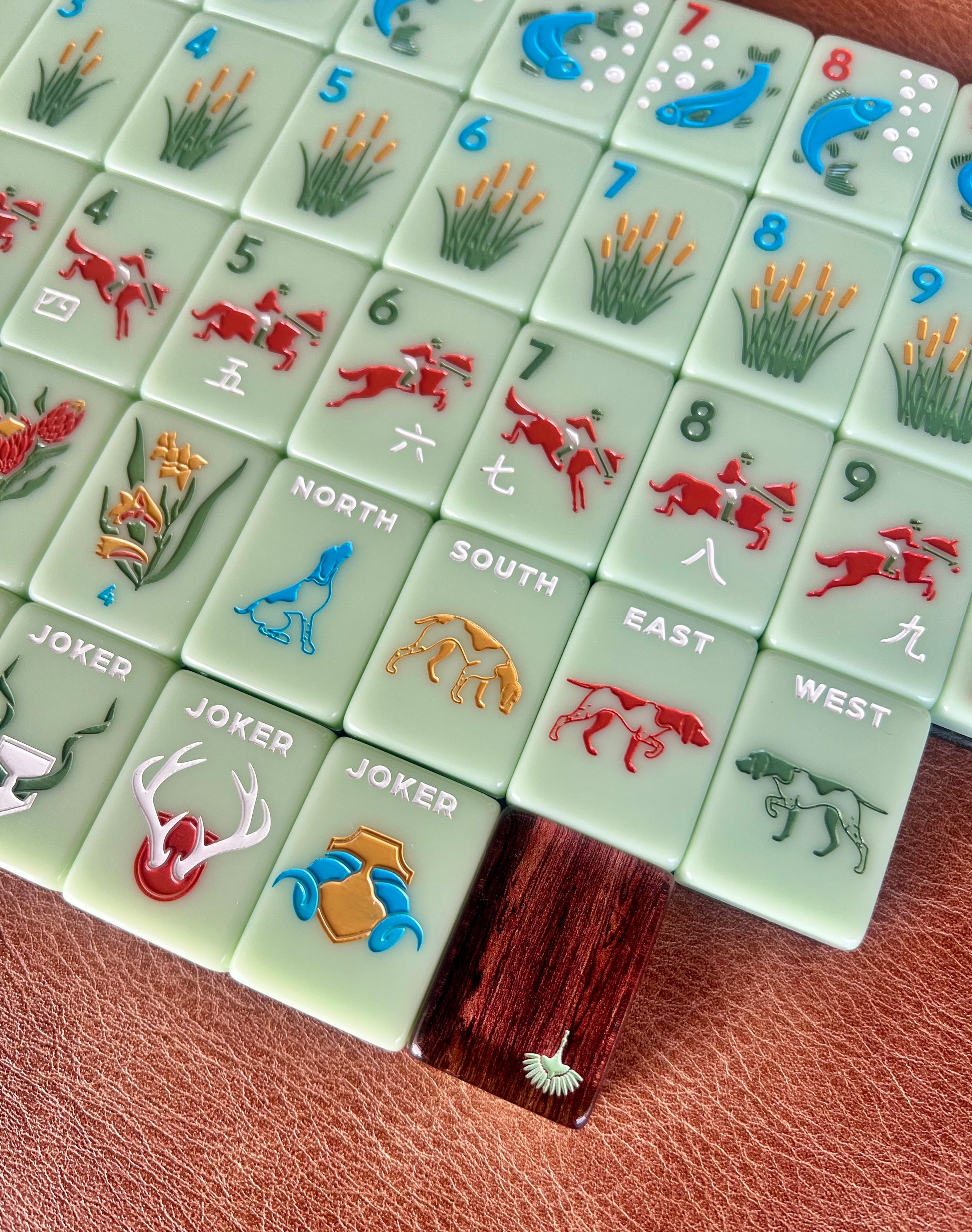 Each tile features a rich, woodgrain-patterned back and a refined sage face, capturing the essence of handcrafted gear and outdoor tradition. Expertly crafted, this luxurious set includes 160 tiles; 4 of each suit tile with matching dragon, 8 whimsical flowers, 4 of each wind, 6 blanks, 10 jokers, 2 field guides and dice.