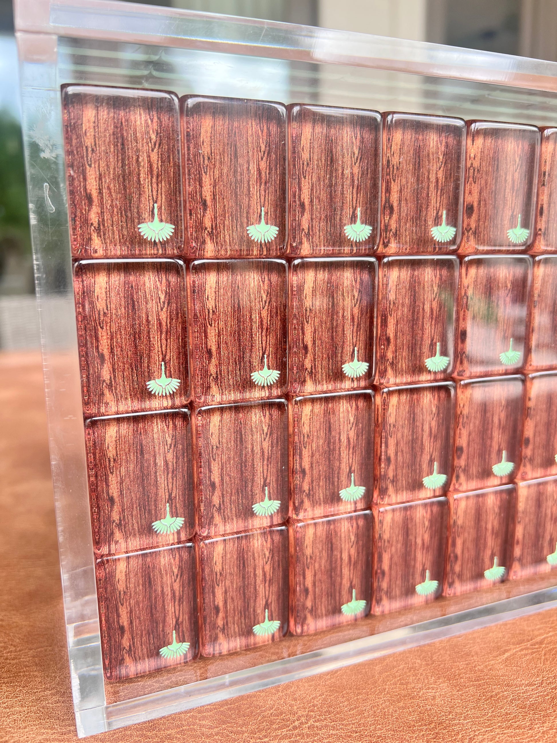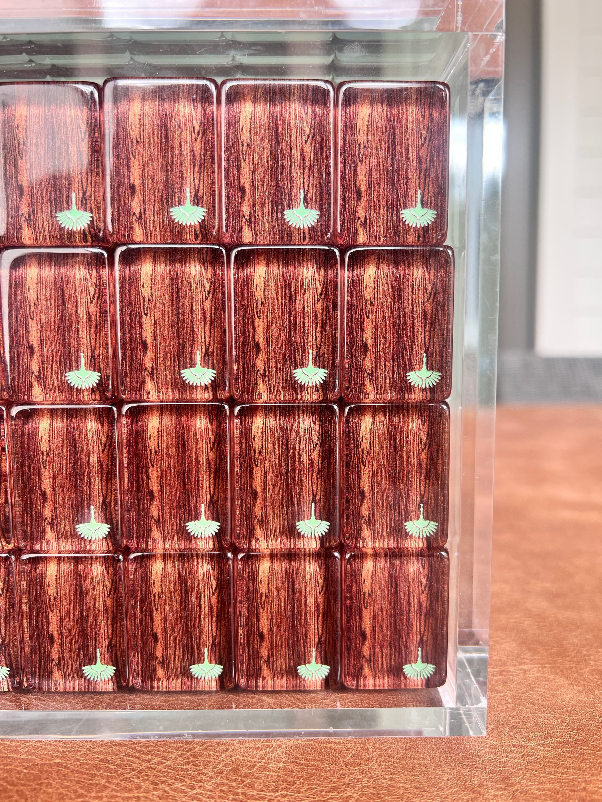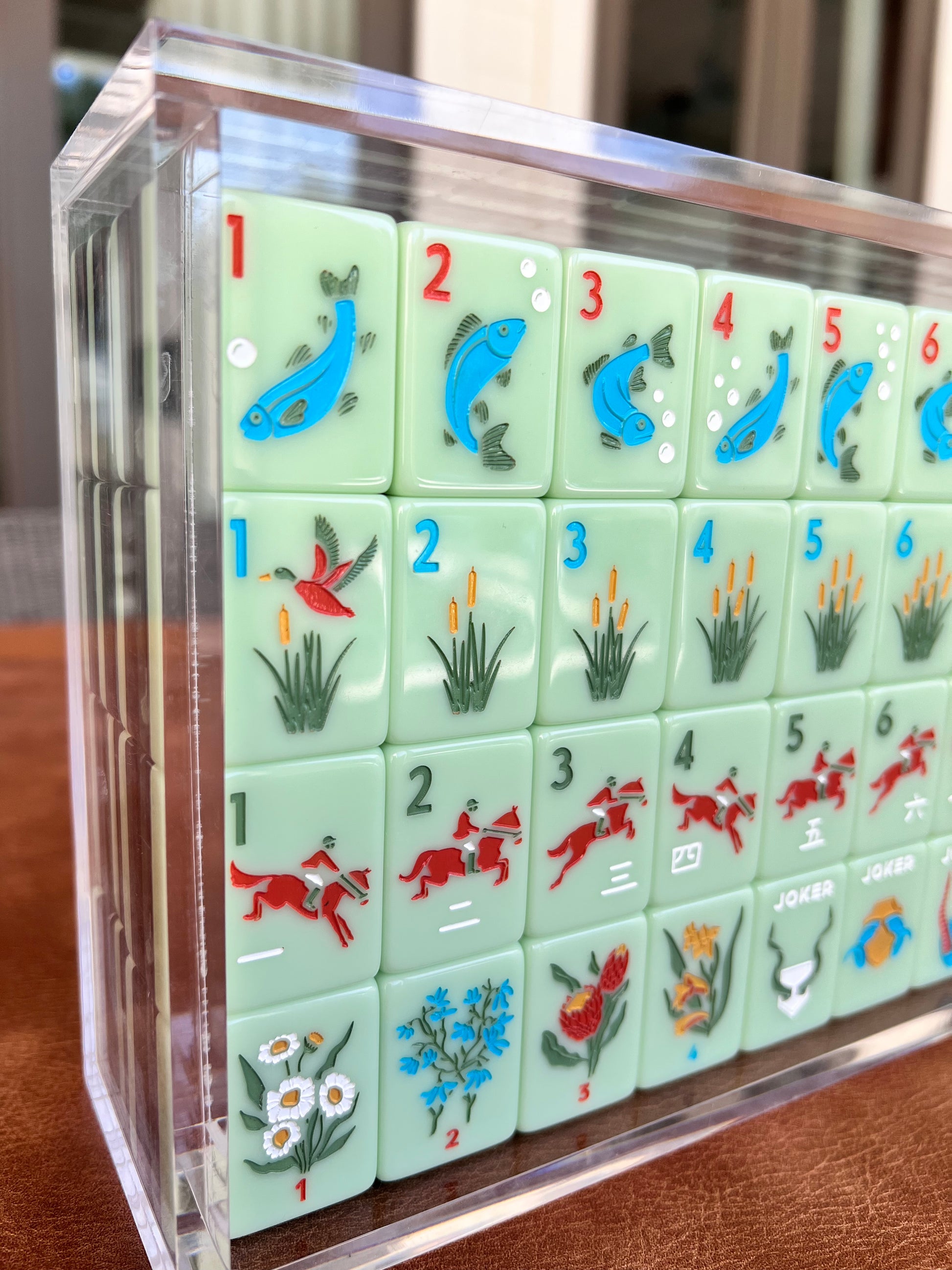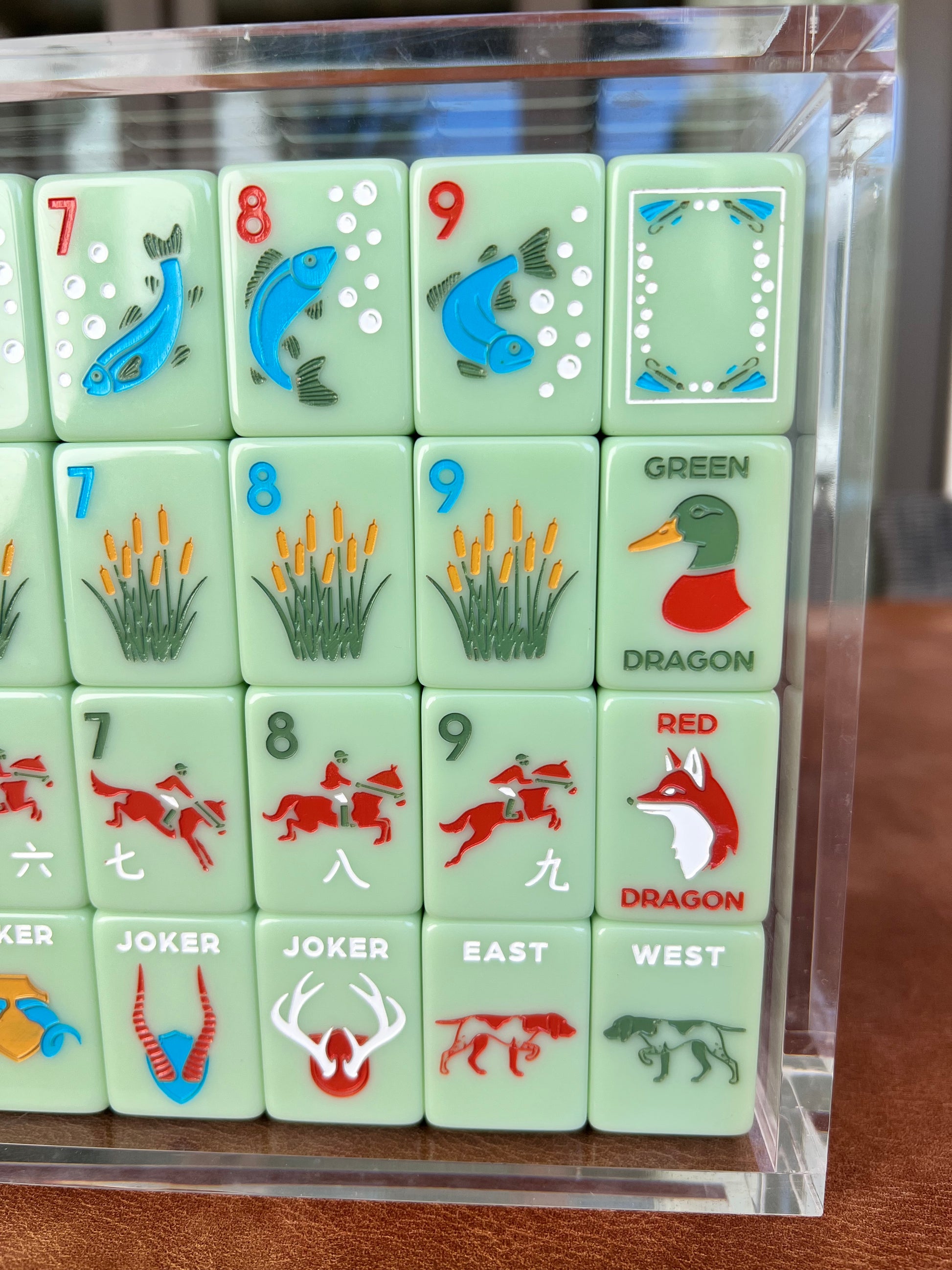 Each tile features a rich, woodgrain-patterned back and a refined sage face, capturing the essence of handcrafted gear and outdoor tradition. Expertly crafted, this luxurious set includes 160 tiles; 4 of each suit tile with matching dragon, 8 whimsical flowers, 4 of each wind, 6 blanks, 10 jokers, 2 field guides and dice.