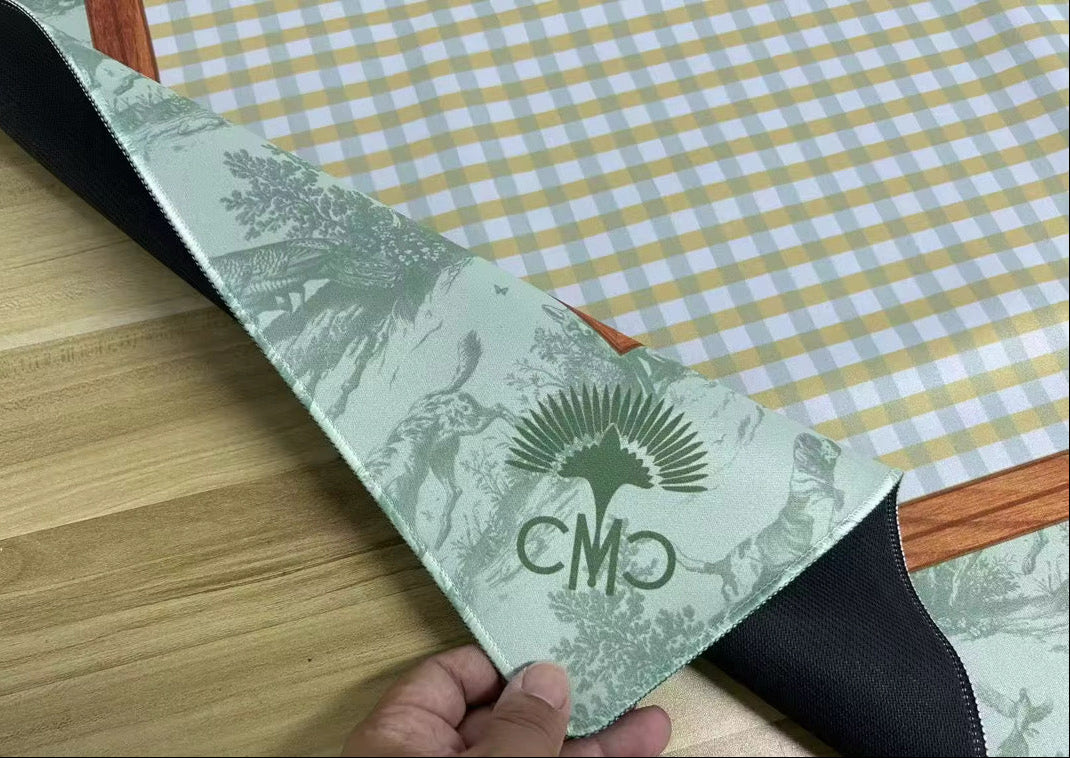 Elevate your Mahjong experience with our Hunt Club Neoprene Game Mat, thoughtfully designed to pair perfectly with our Hunt Club Tile Set. This 32" x 32" square mat features a striking blend of classic design and modern functionality — combining a central gingham pattern framed in a rich wood-grain print to echo the timeless aesthetic of hunt club interiors. A sporting toile motif lines the border, adding refined character and storytelling charm to every game.