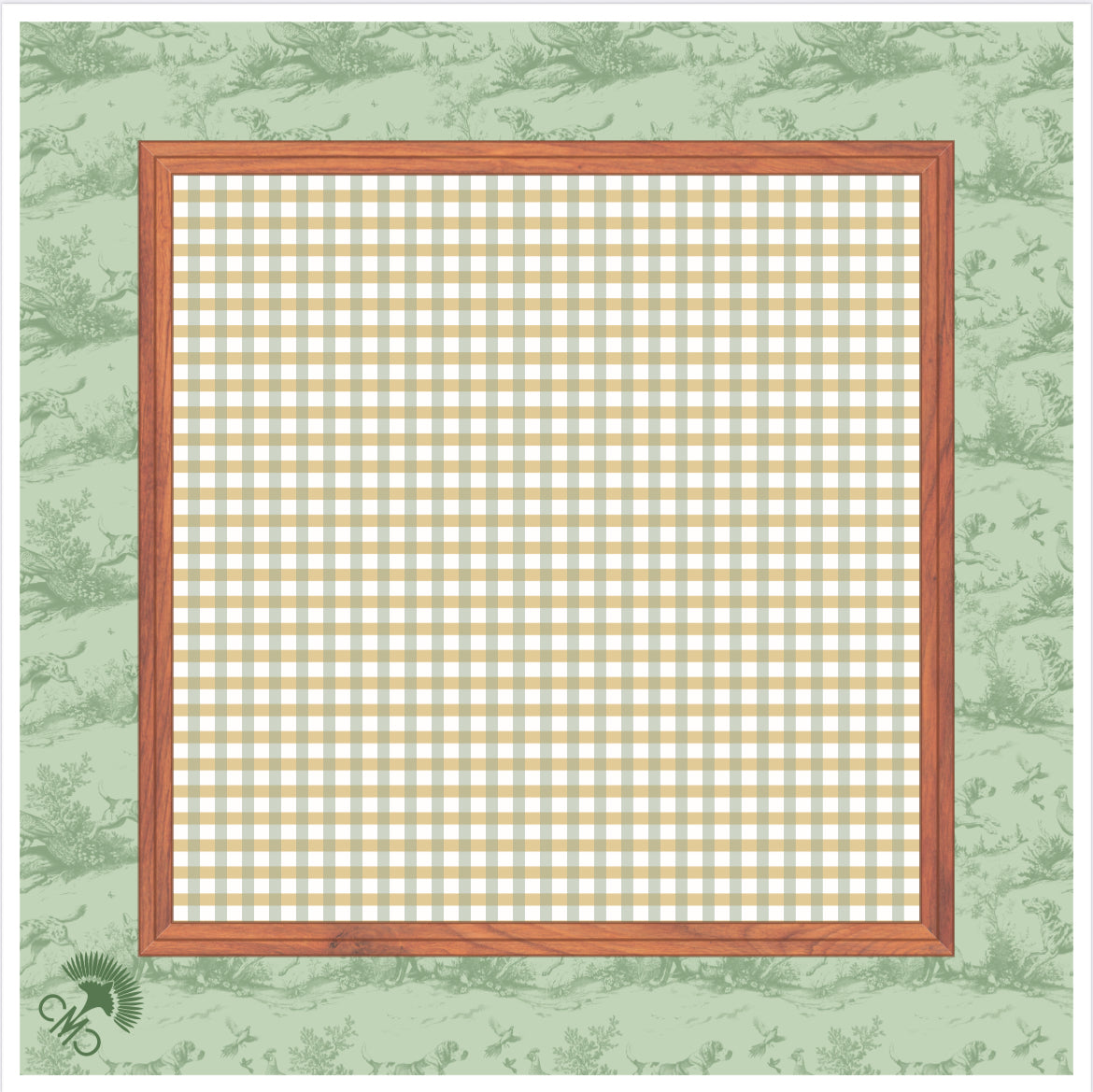 - Center gingham pattern with printed wood frame for a classic hunt club look